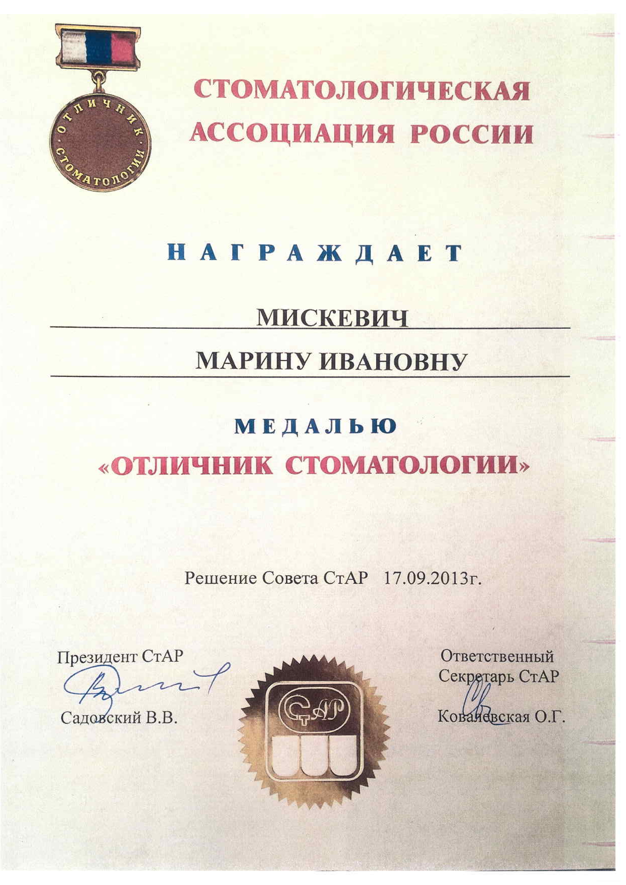 2013 г. — 1 место. Лучший врач года Омской области в номинации «Лучший стоматолог».