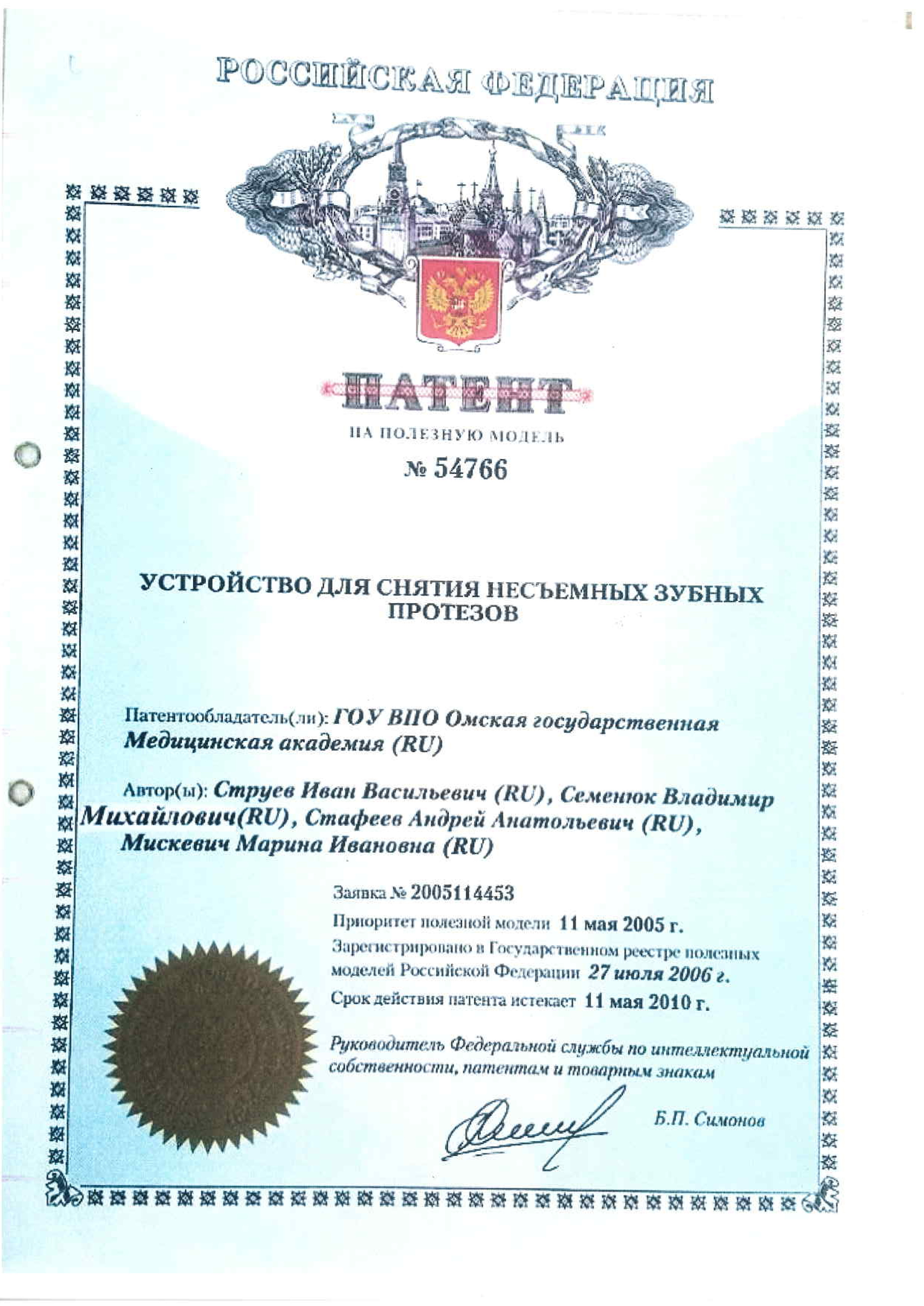 Патент на полезную модель «Устройство для снятия несъемных зубных протезов» (патент № 54766).