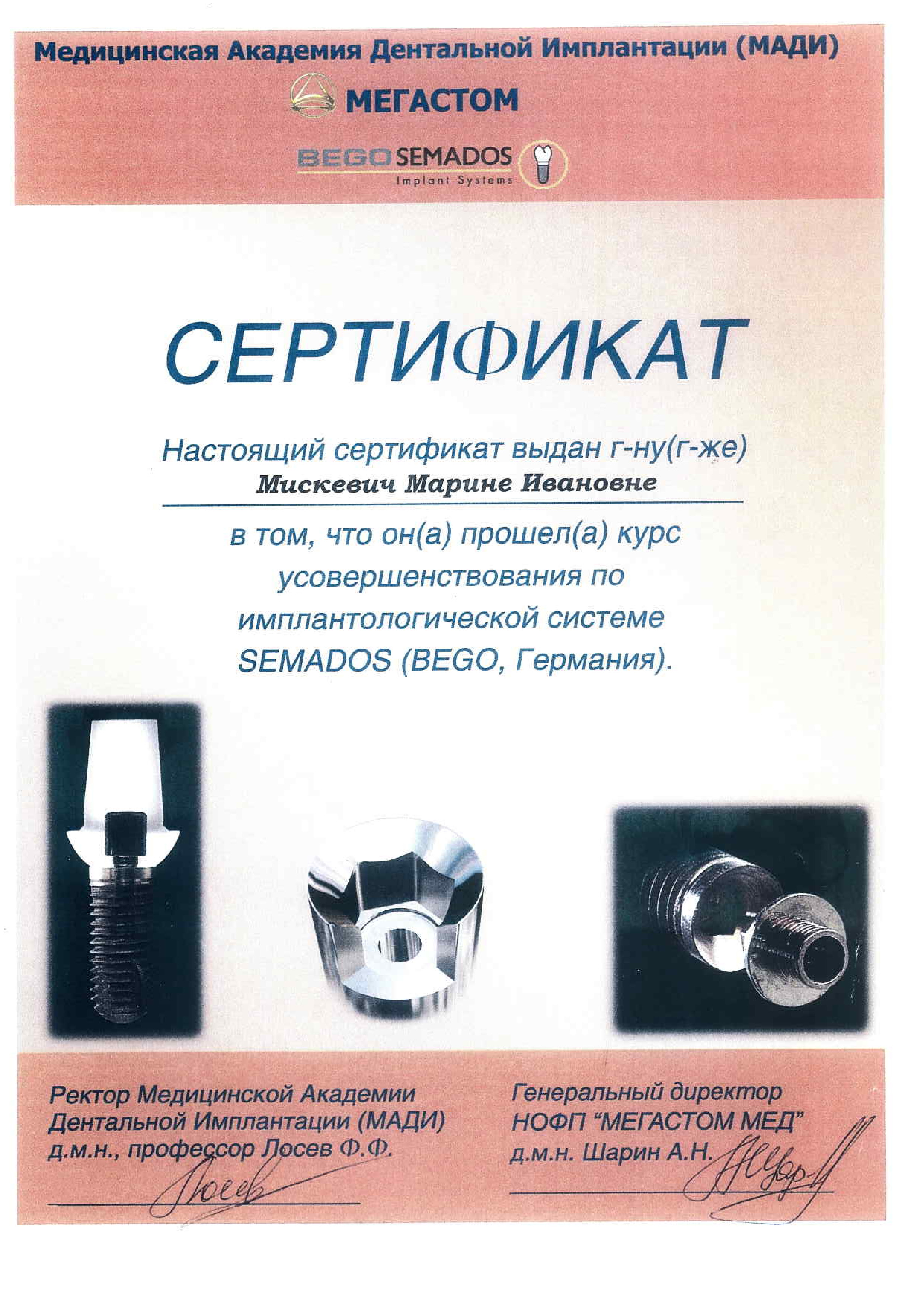 2004 г. Усовершенствование по имплантологической системе Semados (Bego). Москва.