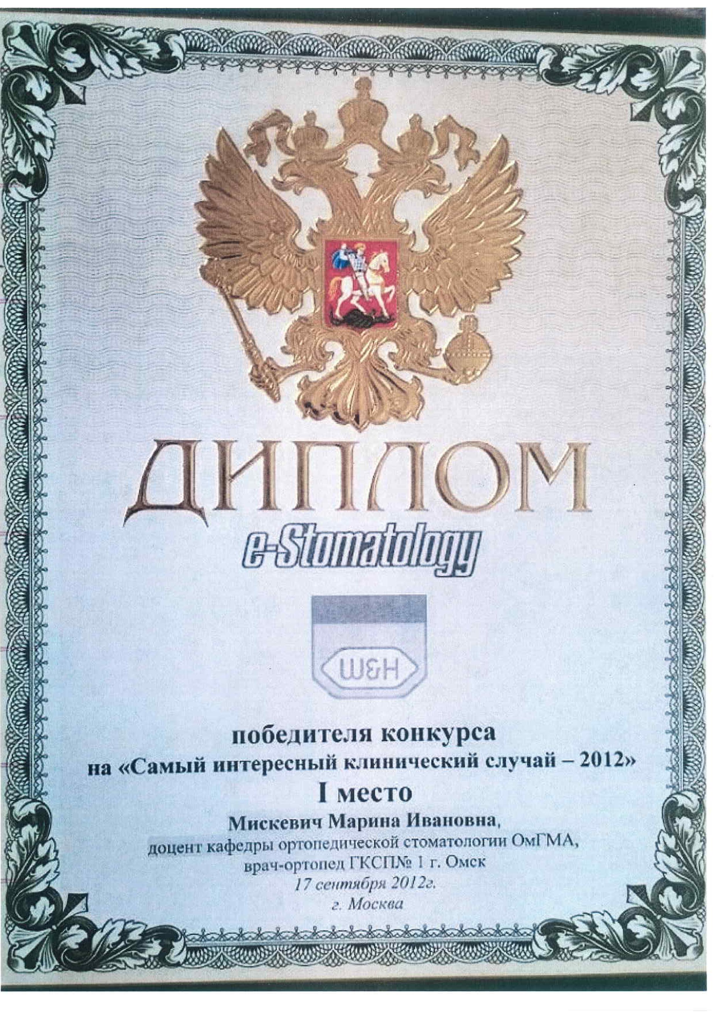 2012 г. — 1 место и диплом победителя конкурса на самый интересный клинический случай, г. Москва.