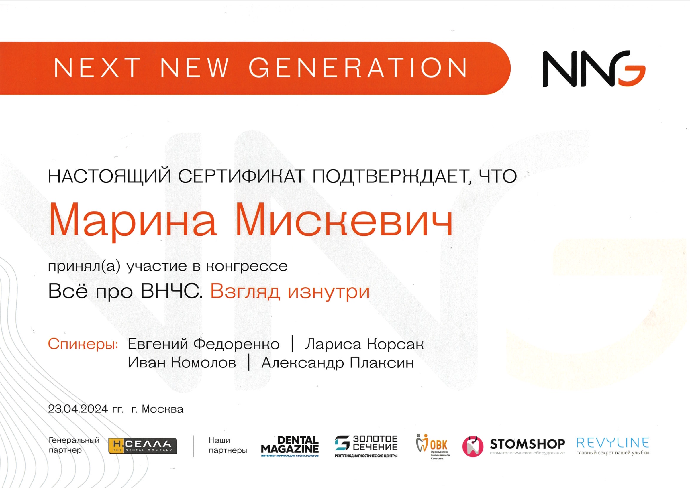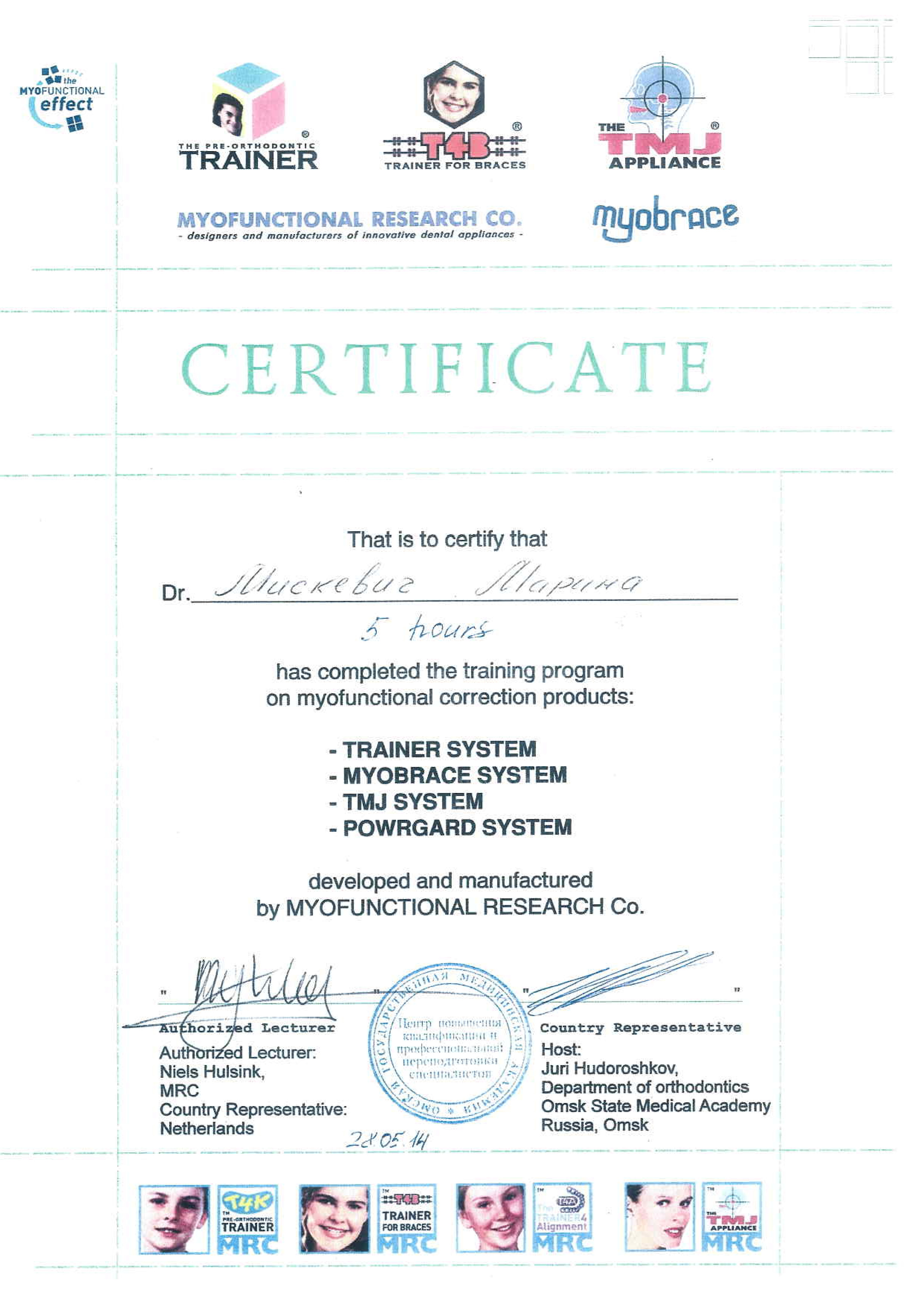 2003 г. «Слагаемые клинического успеха в эстетической стоматологии. Прямой и непрямой методы». «Американ дентал Академи» — повышение квалификации. Москва.