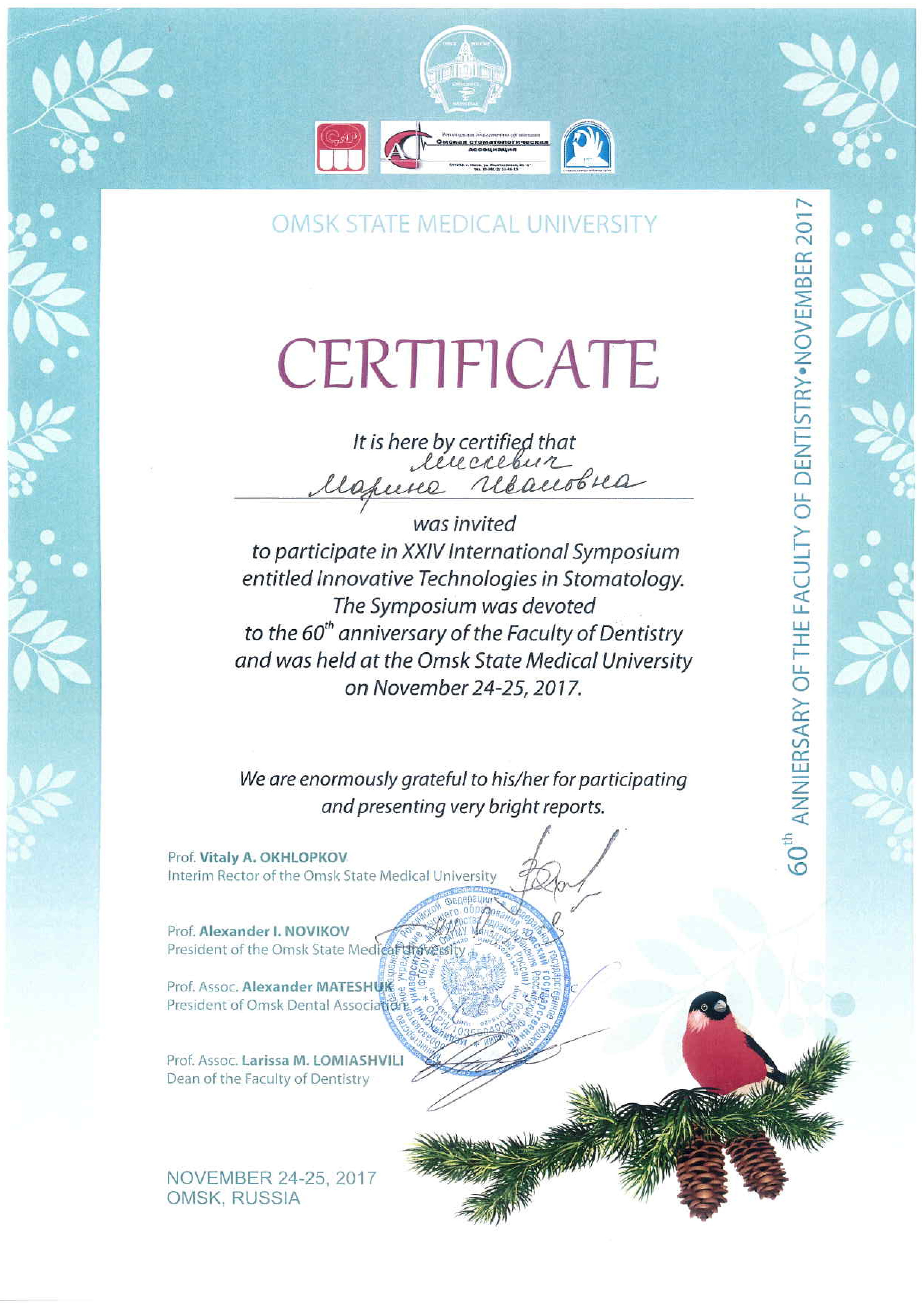 2017 г. «XXIV International Symposium entitled innovative Technologies in Stomatology. The Symposium was devoted