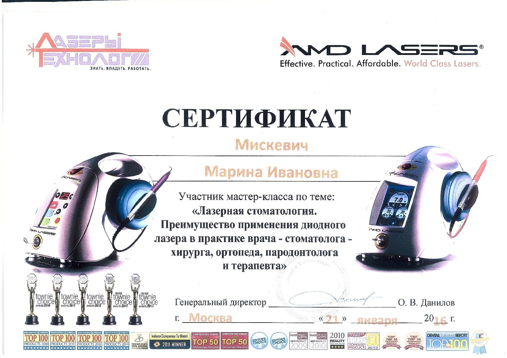 2016 г. «Лазерная стоматология. Преимущество применения диодного лазера в практике врача — стоматолога-хирурга, ортопеда, пародонтолога и терапевта».