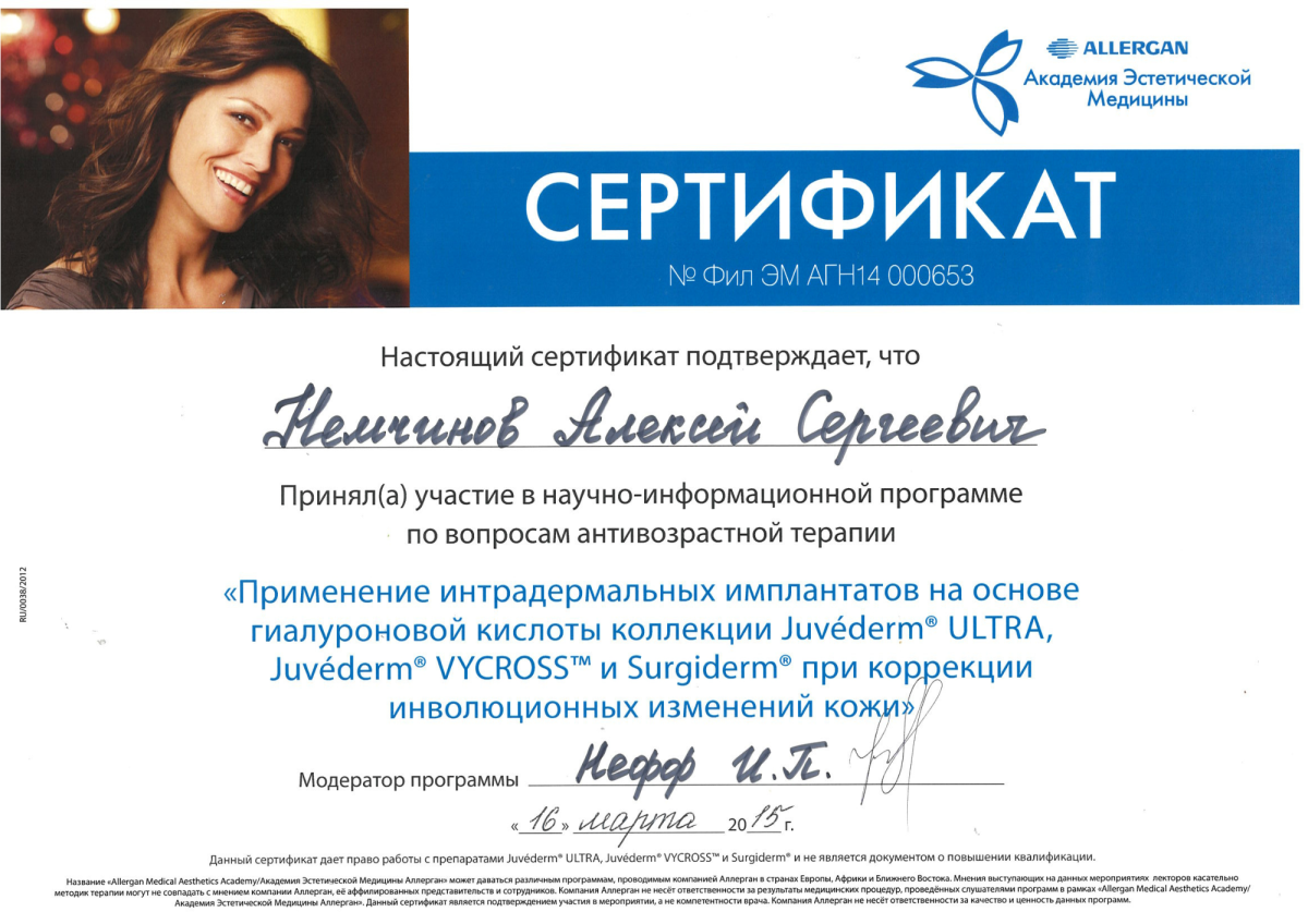 2015 г. Научно-информационная программа по вопросам антивозрастной терапии «Применение интрадермальных имплантатов на основе гиалуроновой кислоты коллекции Juvéderm® ULTRA, Juvéderm® VYCROSS™ n Surgiderm® при коррекции инволюционных изменений кожи»