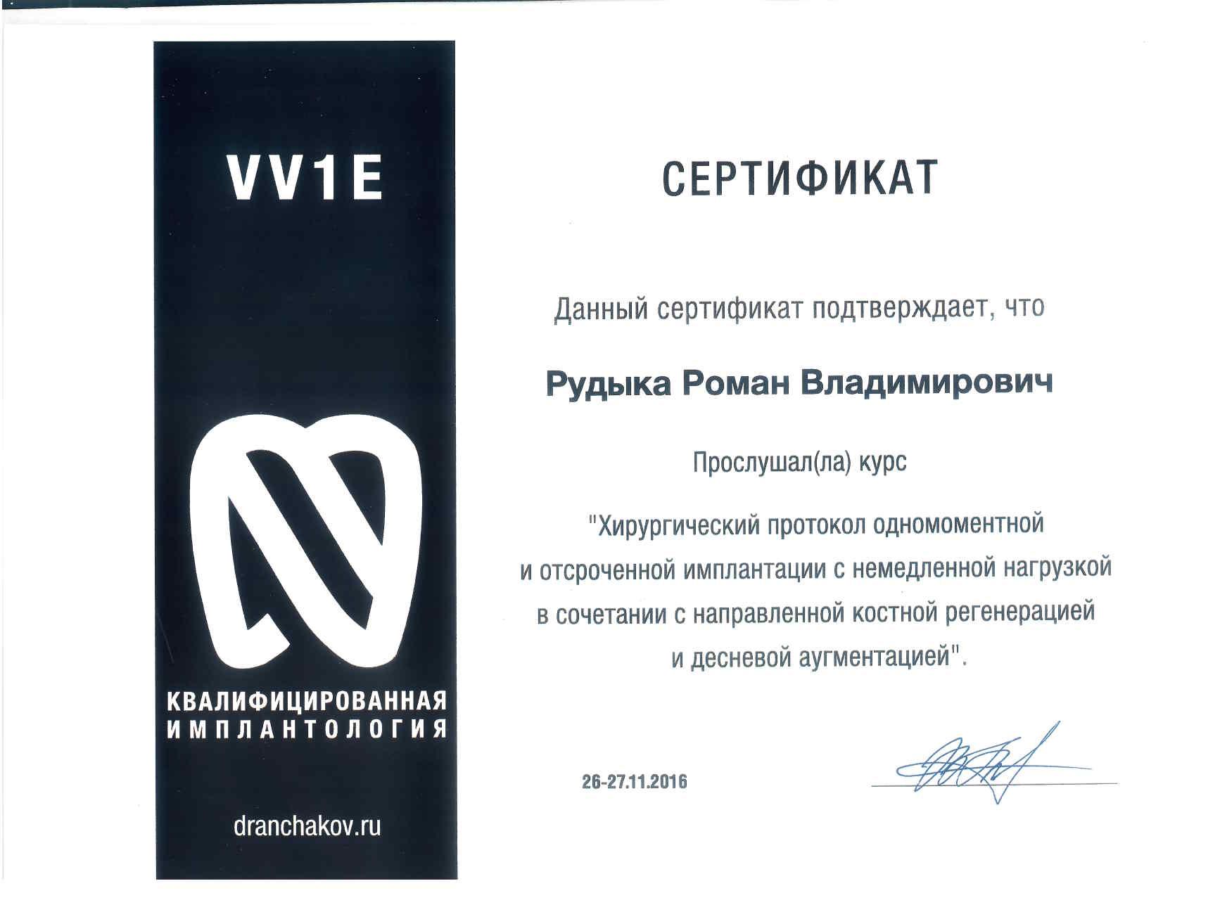 2016 г. курс "Хирургический протокол одномоментной и отсроченной имплантации с немедленной нагрузкой в сочетании с направленной костной регенерацией и десневой аугментацией".