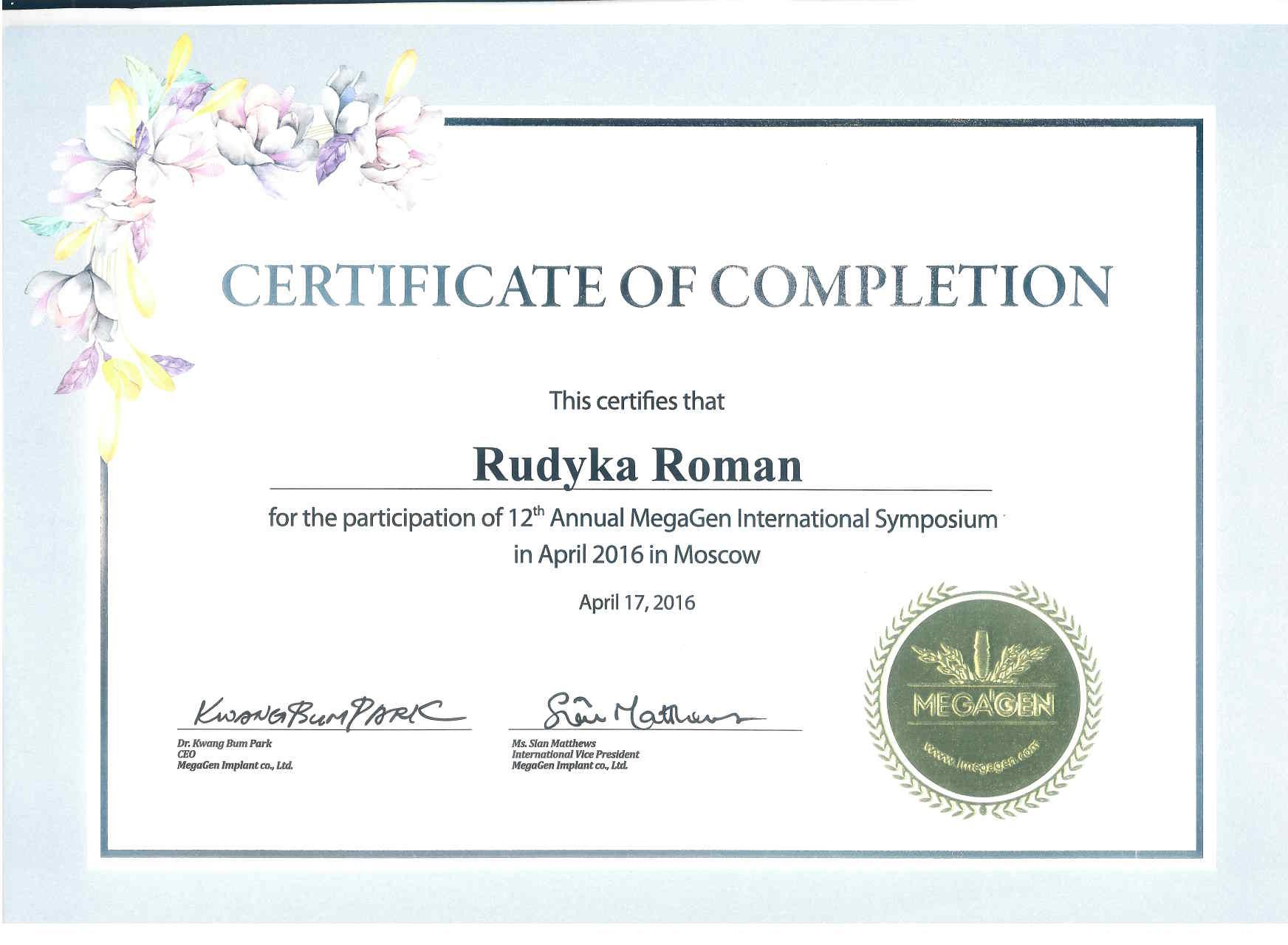 2016 г. — участник XII Международного имплантологического симпозиума MEGAGEN For Lifetime Smiles.