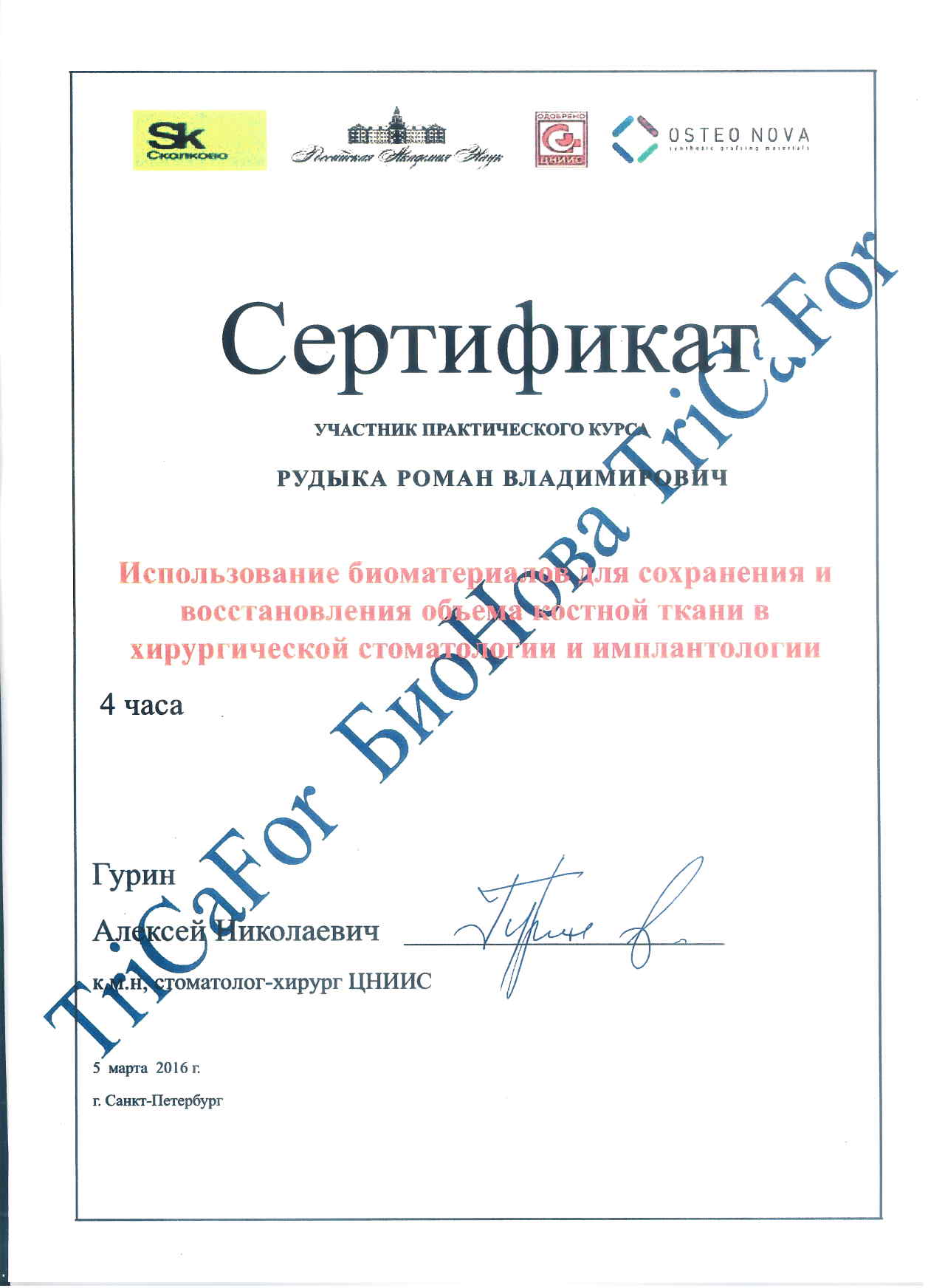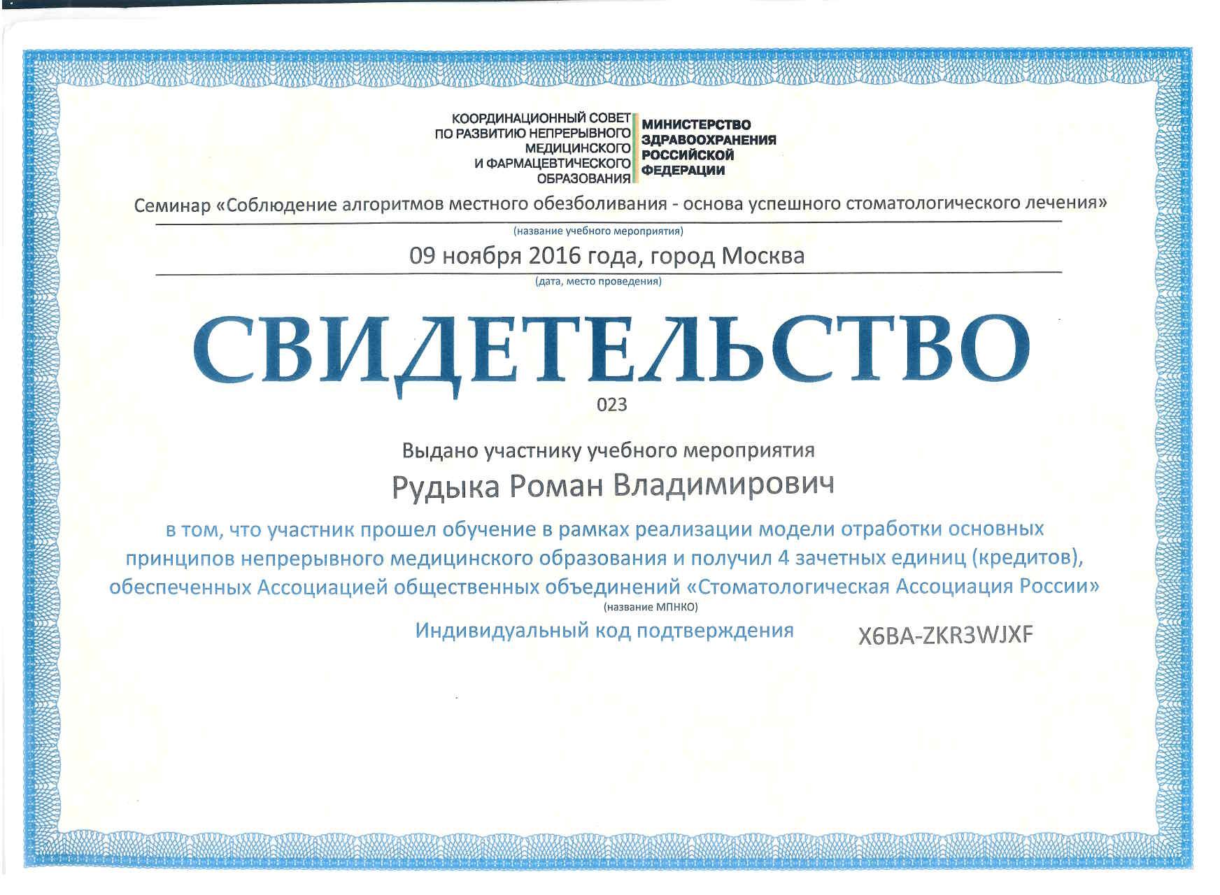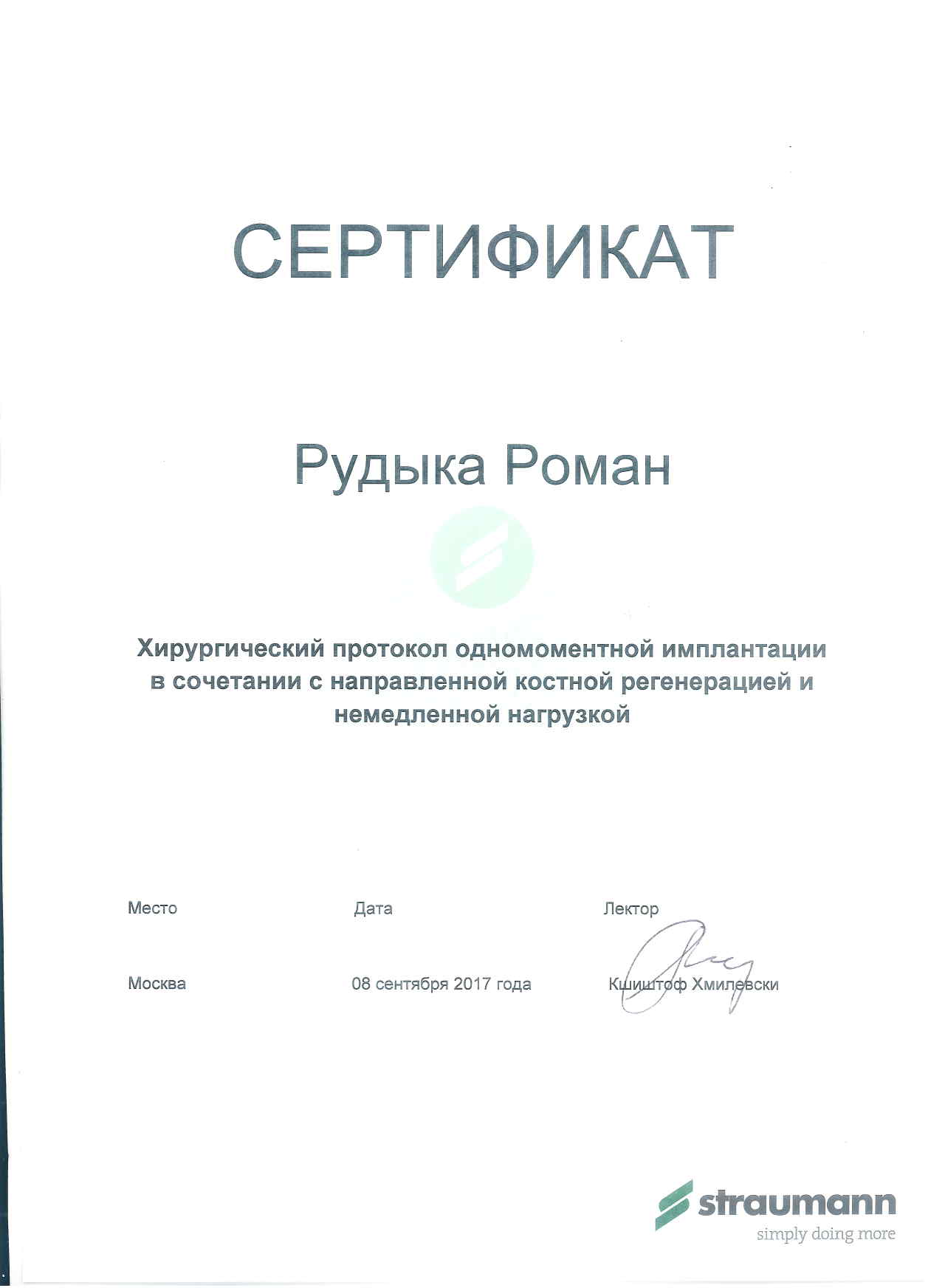 2009 г. — сертификат по специальности «имплантация» на базе учебного центра «МираДент» на системе имплантации AstraTech.