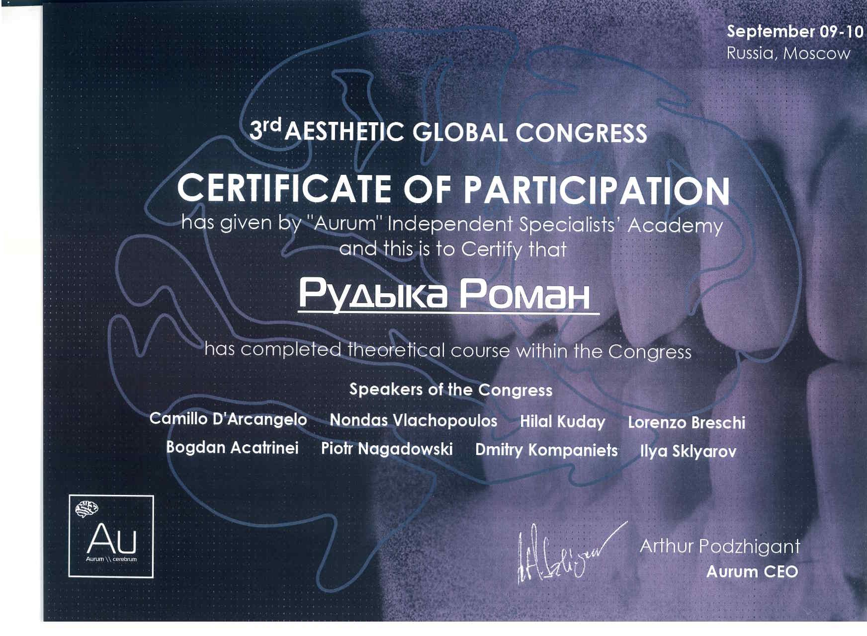 2014 г. — курс Global Medical System «Реконструкция дна верхнечелюстного синуса, наращивание кости, имплантация, ортопедическая реабилитация».