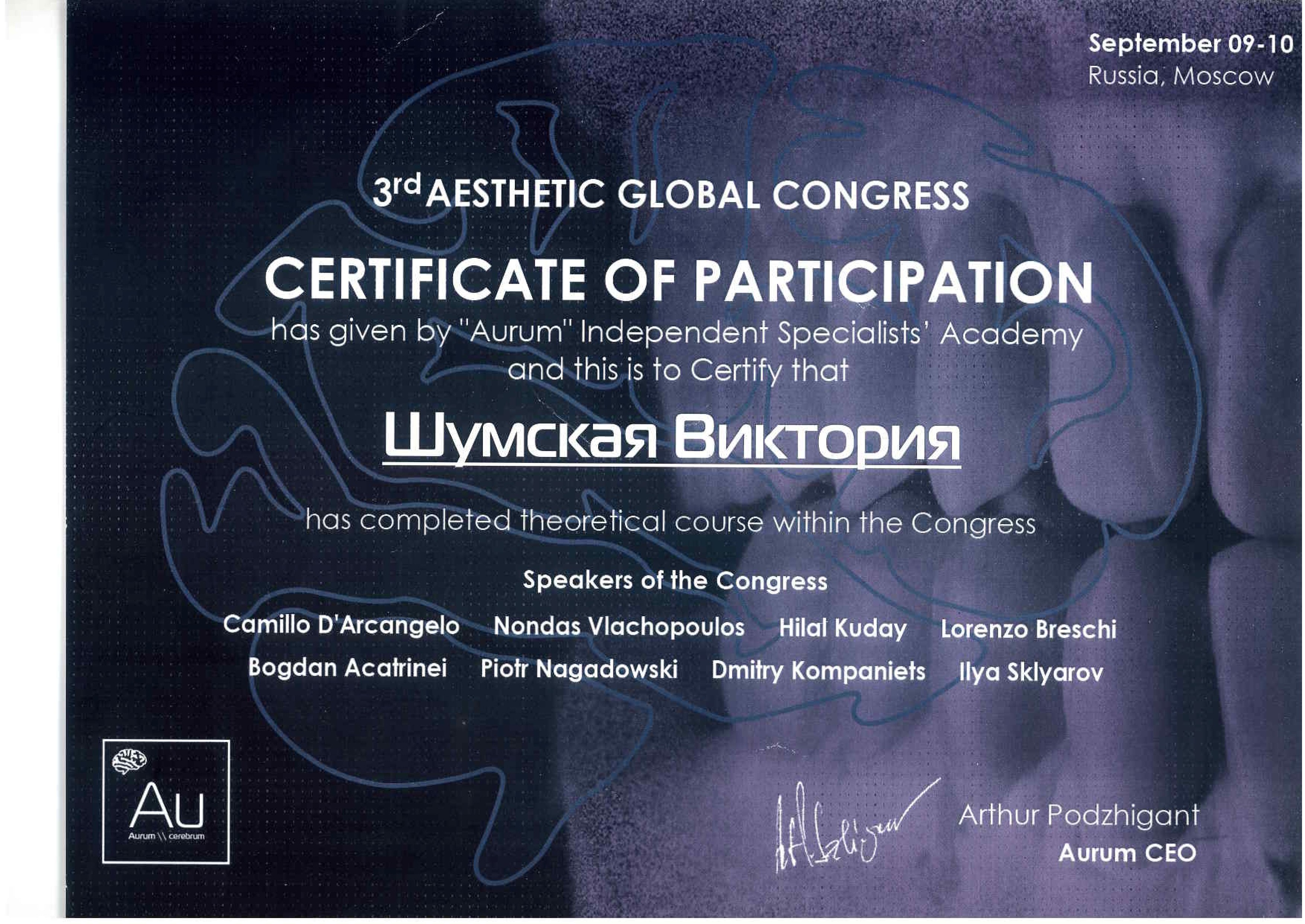 2009 г. Москва. Цикл курсов проф. Г. Славичека (Steinbeis-Transfer-Institute): «Введение в реконструктивную стоматологию», «Биотехнология в междисциплинарной стоматологии. Функциональные аспекты окклюзии. Клинический функциональный анализ», «Диагностическое восковое моделирование».