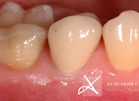 - На индивидуальный абатмент зацементирована эстетическая керамическая коронка.