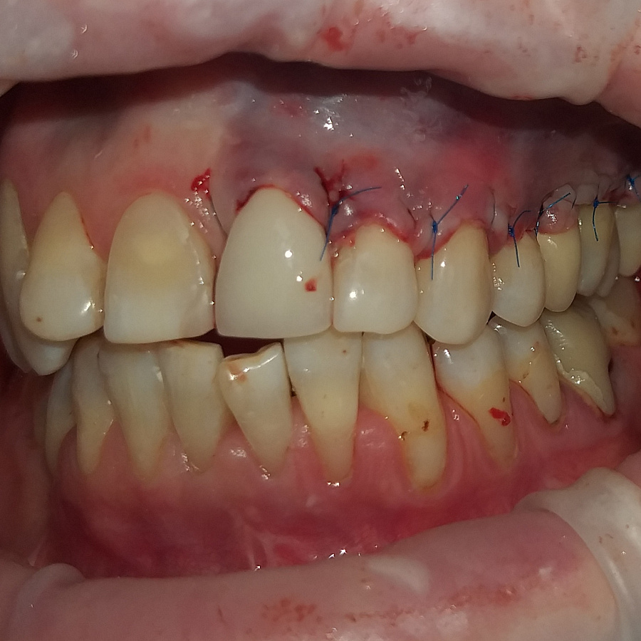 Операция по закрытию рецессии десны мягкими тканями - перемещение полнослойного слизистого лоскутка. Операцию проводил хирург Денис Черкашин.