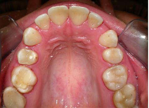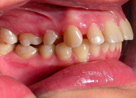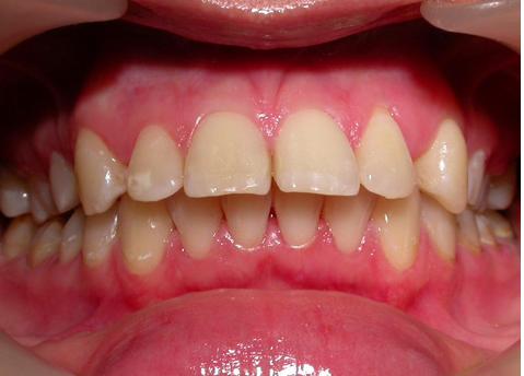 Дистальная окклюзия, глубокая резцовая дизокклюзия, удлинение верхнего зубного ряда за счет протрузии резцов, палатиноокклюзия в области 16 и 26, множественные тремы, адентия 14 и 24 (удалены по ортодонтическим показаниям).