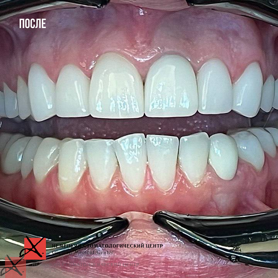Теперь у пациентки красивая и здоровая улыбка с сохранёнными своими зубами, и хороший гармоничный контур лица. Губы стали более пухлыми, потому что сейчас они лежат на ровных зубках.