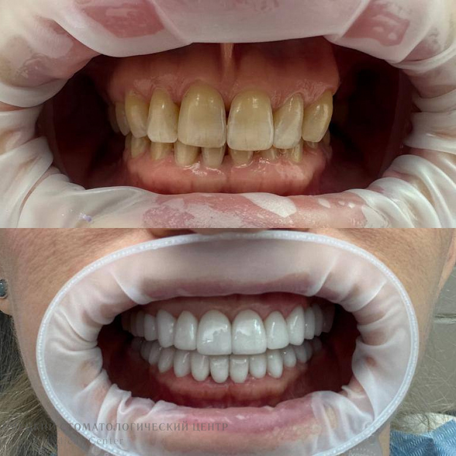 Проведена большая комплексная реабилитация, работала команда докторов. Были установлены виниры, коронки и импланты.