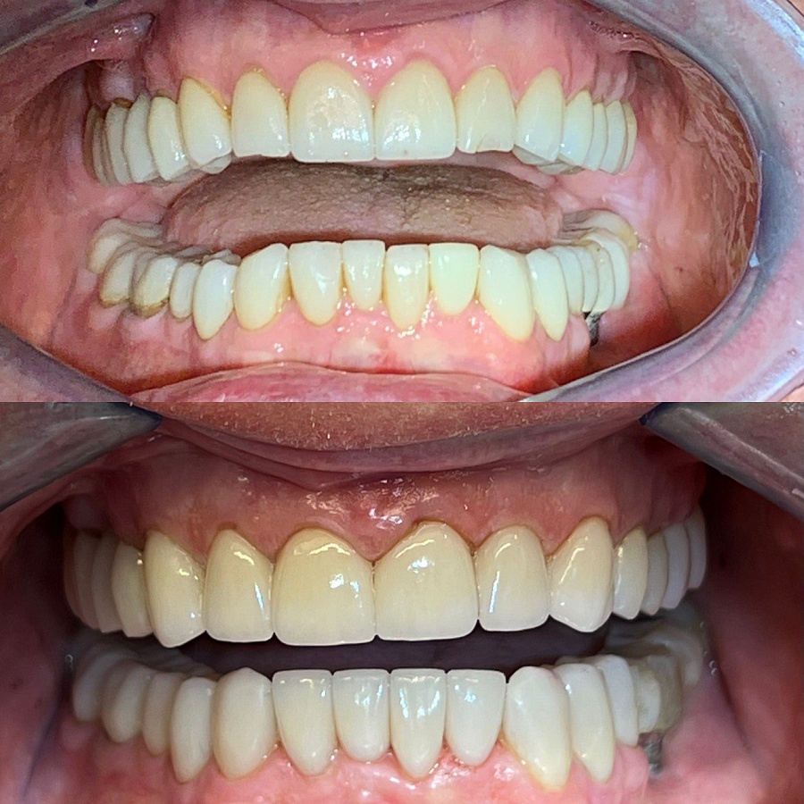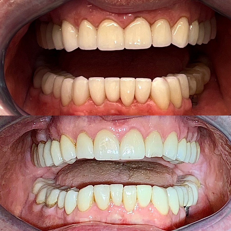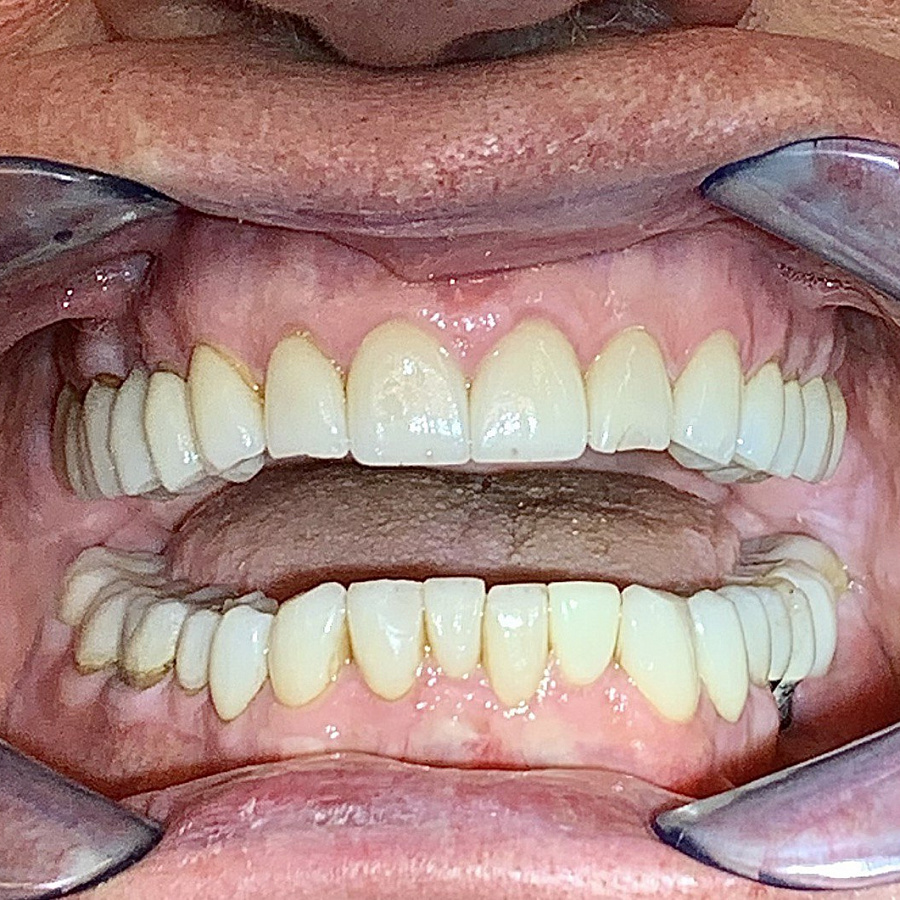 Была проведена частично-тотальная реабилитация, переделаны передние зубы, частично переделаны боковые зубы, удален несостоятельный имплантат и проведена повторная имплантация.