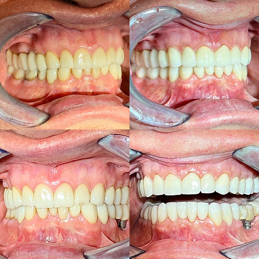 В другой клинике пациенту было выполнено тотальное протезирование, в результате которого произошло снижение высоты нижней третьей лица, что вызвало компрессию суставов, многочисленные сколы керамики, и суставные и мышечные боли.