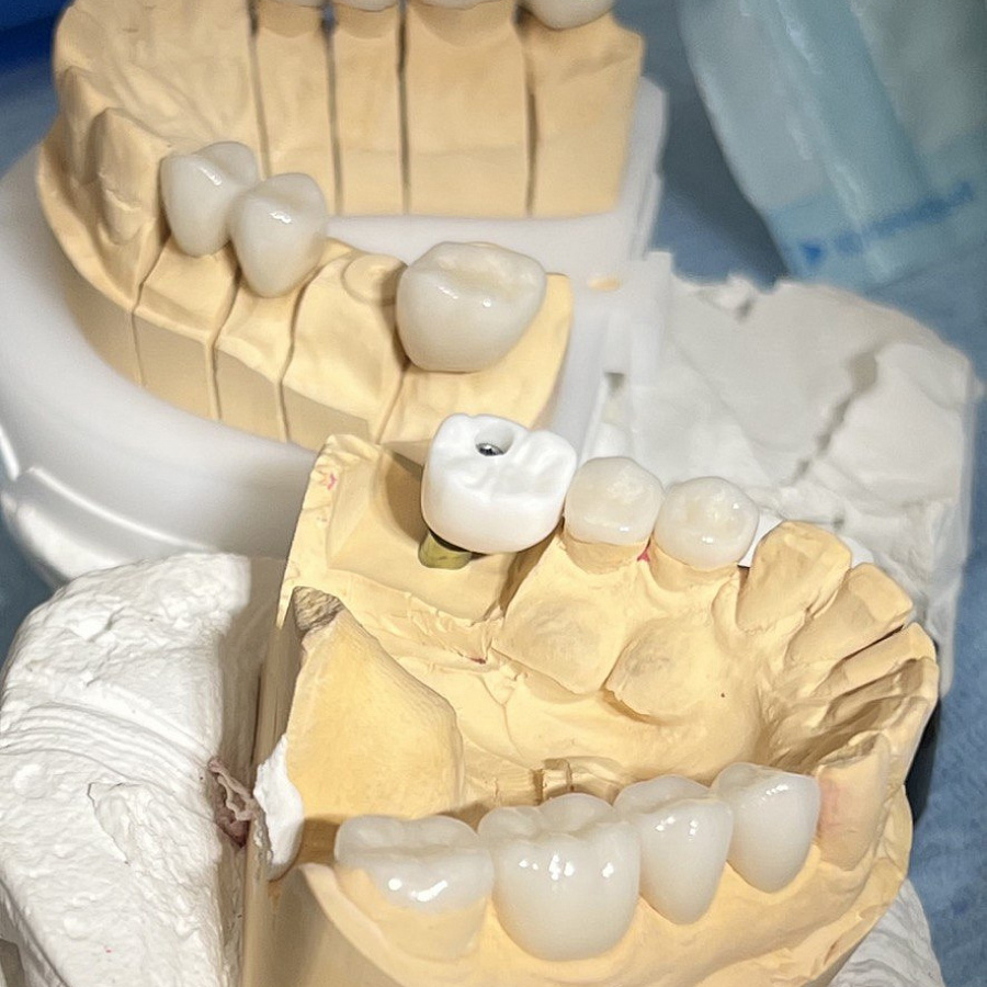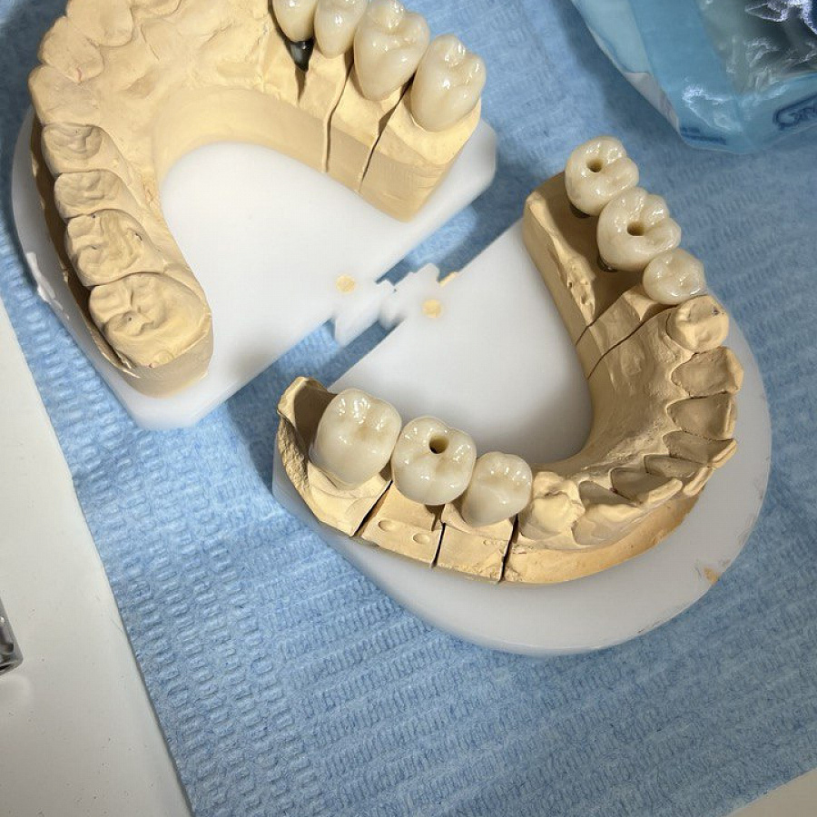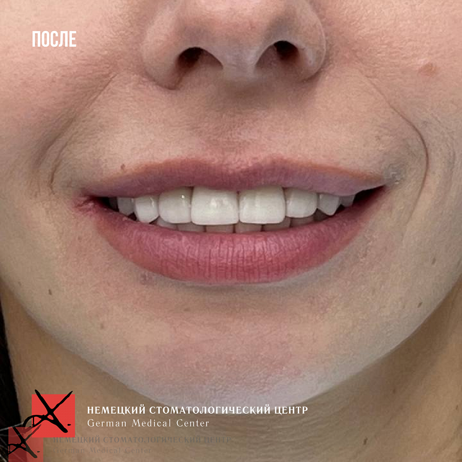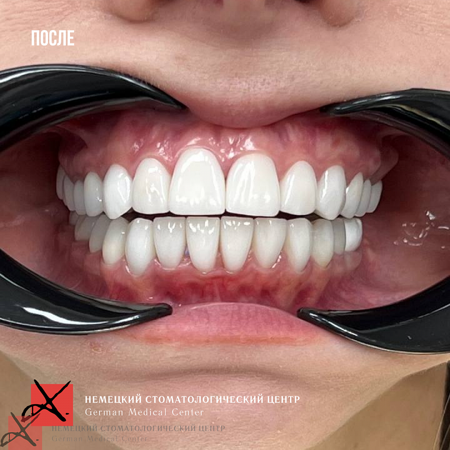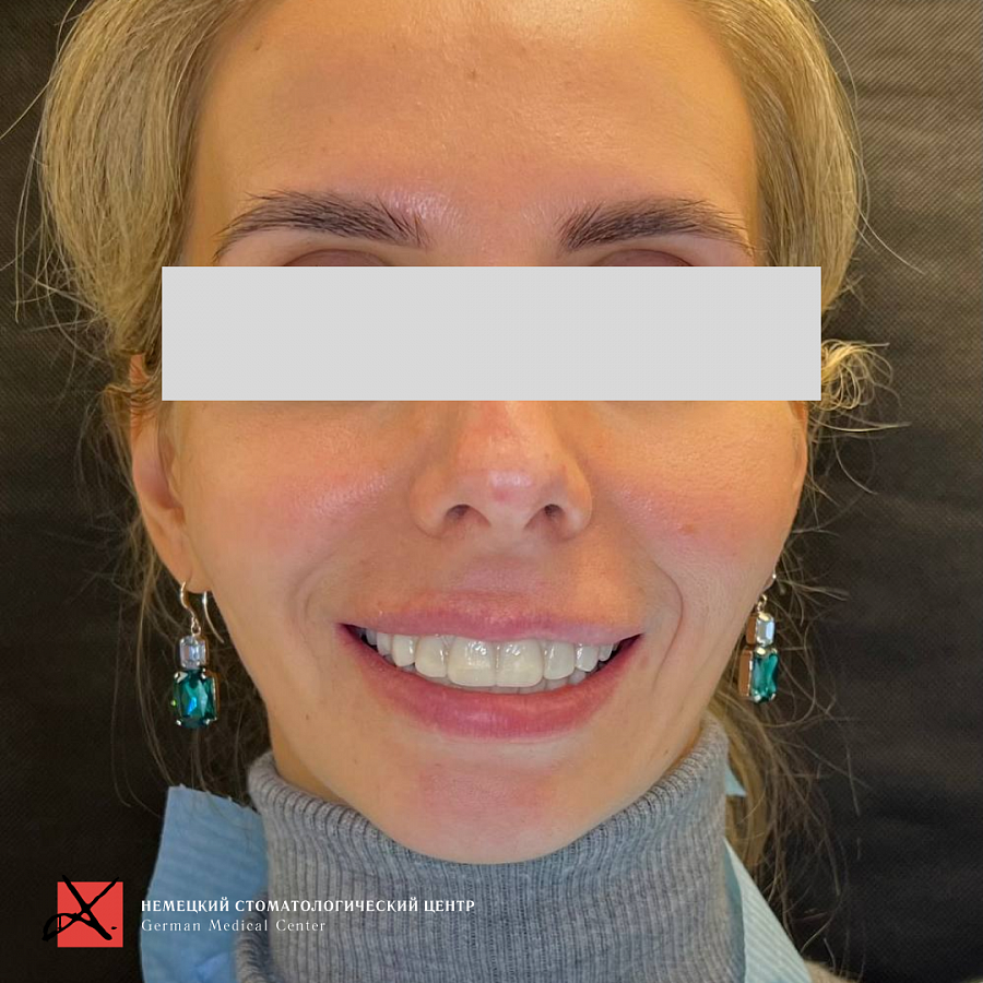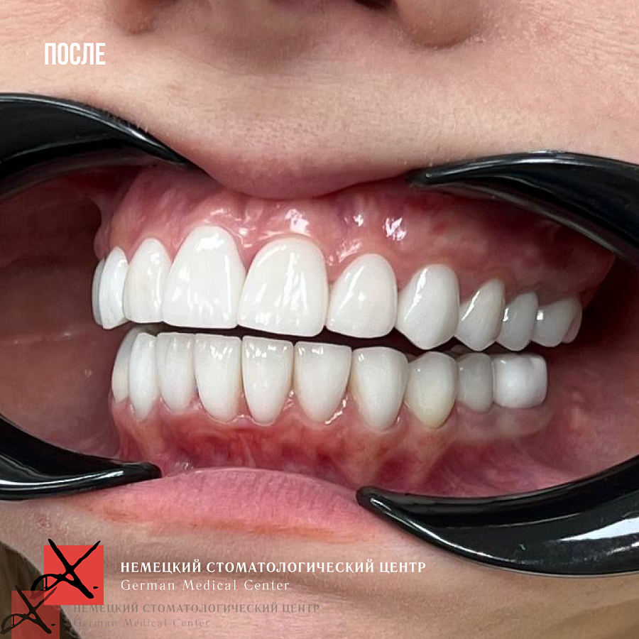 Основная проблема, с которой мы столкнулись - это отсутствие достаточного объема костной ткани для проведения качественной ортодонтии. Поэтому была выполнена частичная ортодонтия - перемещение зубов в имеющейся костной ткани в пределах возможного. Нижняя челюсть зафиксирована в нужном терапевтическом положении, комфортном для сустава. Далее было проведено ортопедическое лечение и реабилитация как боковых, так и передних отделов зубов.