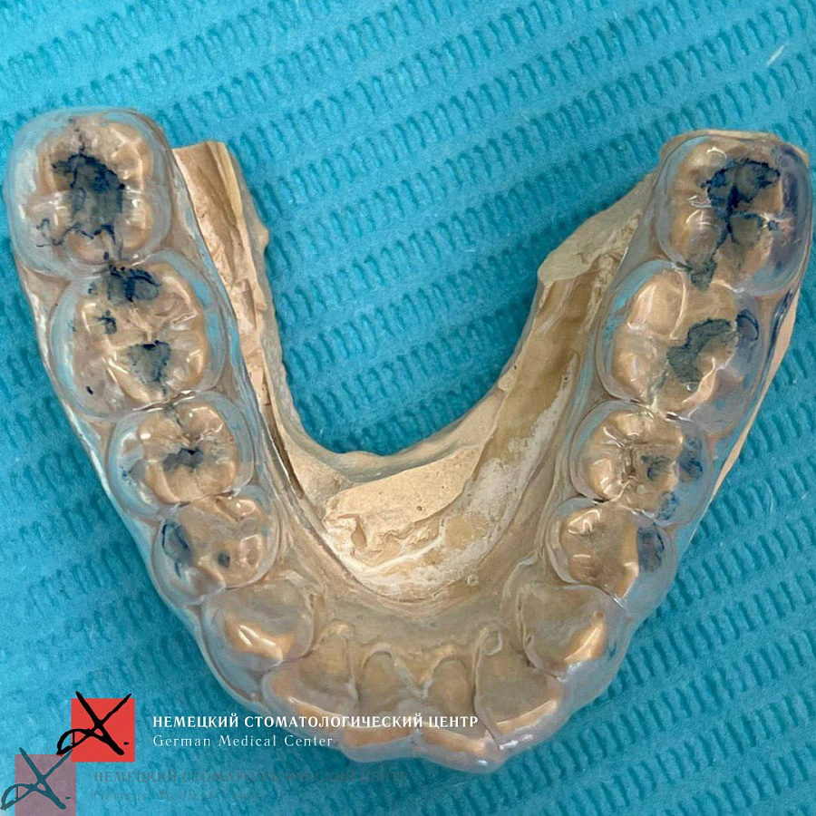 Сейчас идет стабилизация прикуса и фиксация мышечного каркаса на ортотике. Пациентка спокойно открывает рот, что позволяет проводить санацию полости рта. Дальше по плану протезирование.