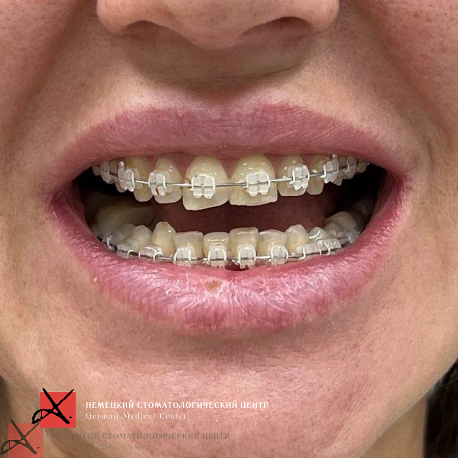Сначала было проведена санация полости рта. Затем а ортодонтическое лечение для восстановления высоты прикуса.