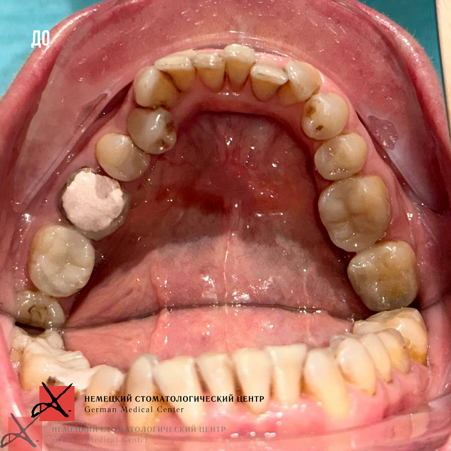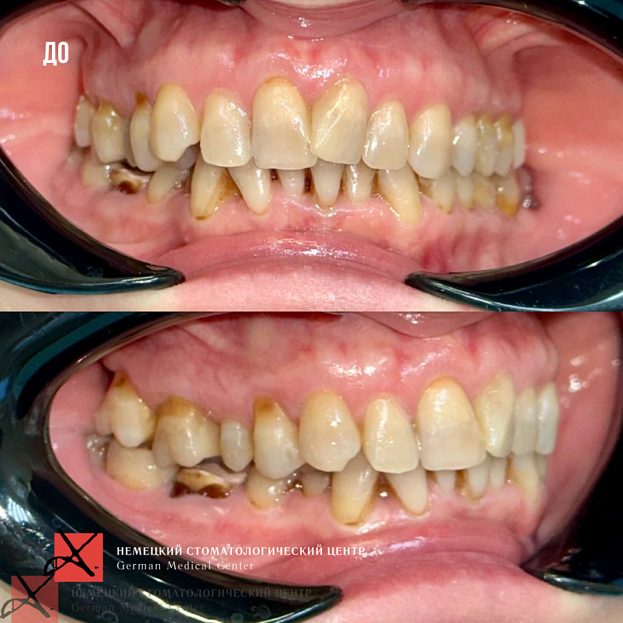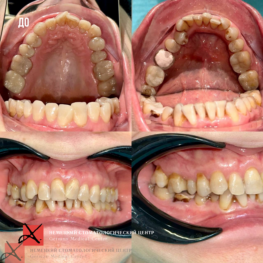 Пациентка 57 лет обратилась с жалобами на сильную боль ощущения в левом височно-челюстном суставе. Также пациентку беспокоил эстетический дефект в виде скученности зубов.