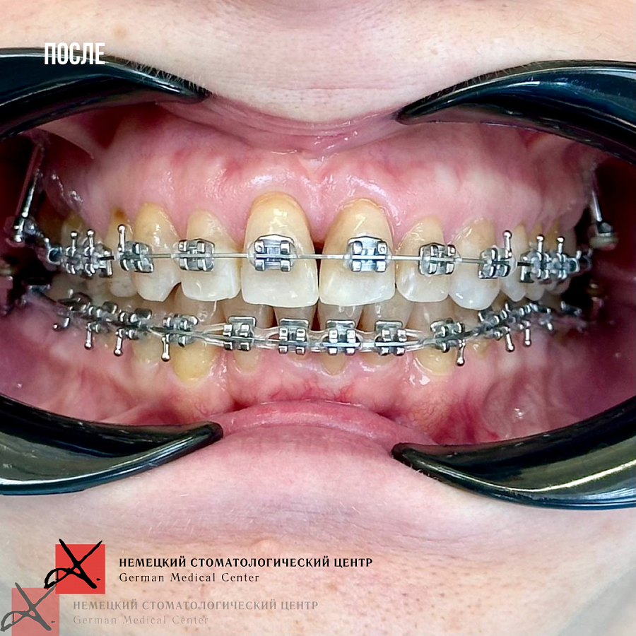 На данный момент пациентка в процессе ортодонтического лечения брекетами. Боли в ВНЧС ушли. Промежуточный результат по эстетической части уже впечатляет (и нас, и пациентку).