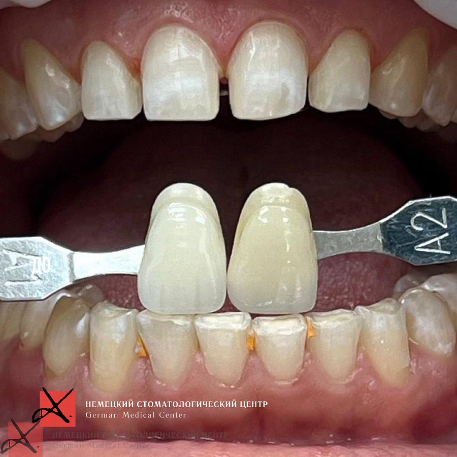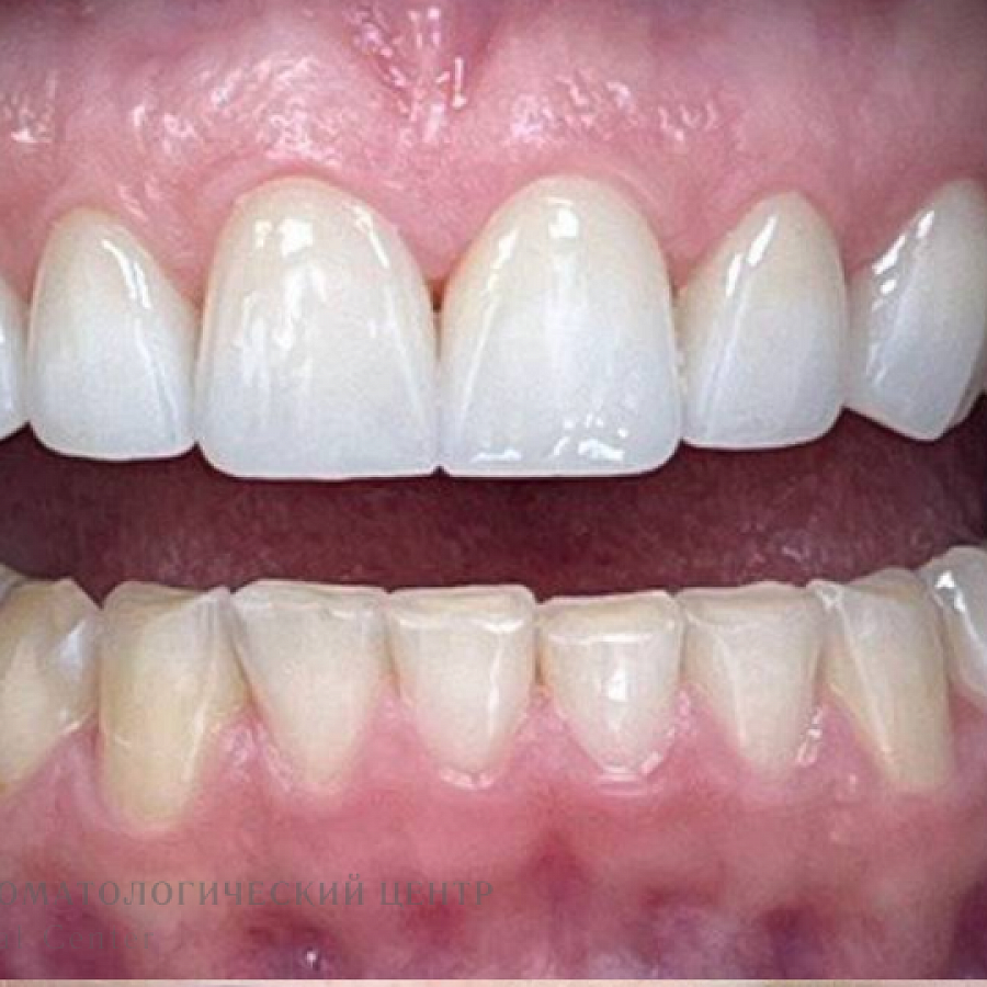 В связи с отсутствием у пациентки достаточной длины клыков и резцов, мы провели протезирование передней группы зубов тонкостенными винирами с минимальным препарированием (так хотела пациентка). Задача с протезированием была непростой, т.к. нужно было идеально попасть в цвет, чтобы виниры и свои зубы выглядели идентично.