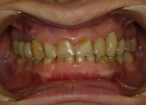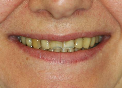 Пациентка обратилась с жалобами на неудовлетворительную эстетику зубов. Присутствовали жалобы на эпизодические головные боли, ассимметричные боли и хруст в области височно нижнечелюстных суставов (ВНЧС), стискивание зубов, сухость слизистой оболочки полости рта.