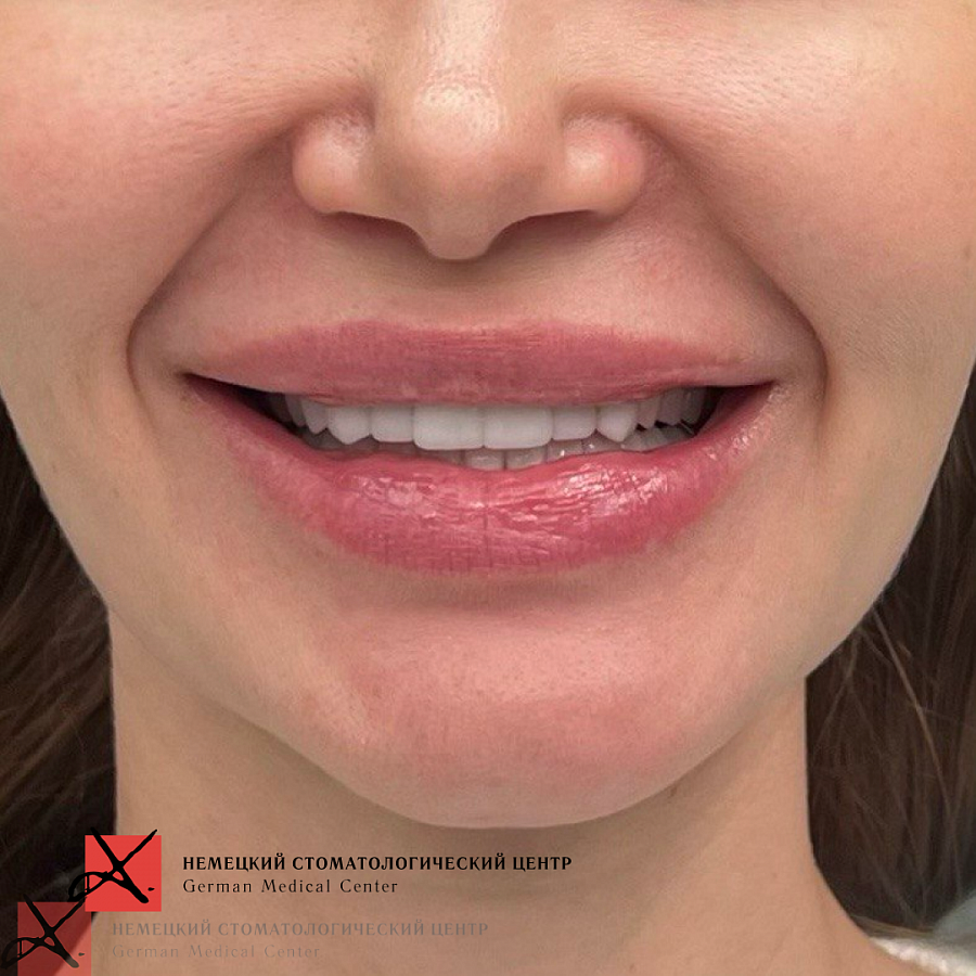 Кроме того страдала эстетическая часть, пациентке не нравилась её десневая улыбка (когда она улыбается, видно большое количество десны).