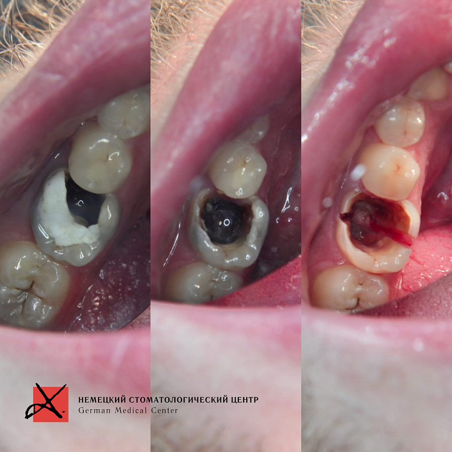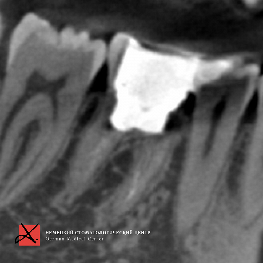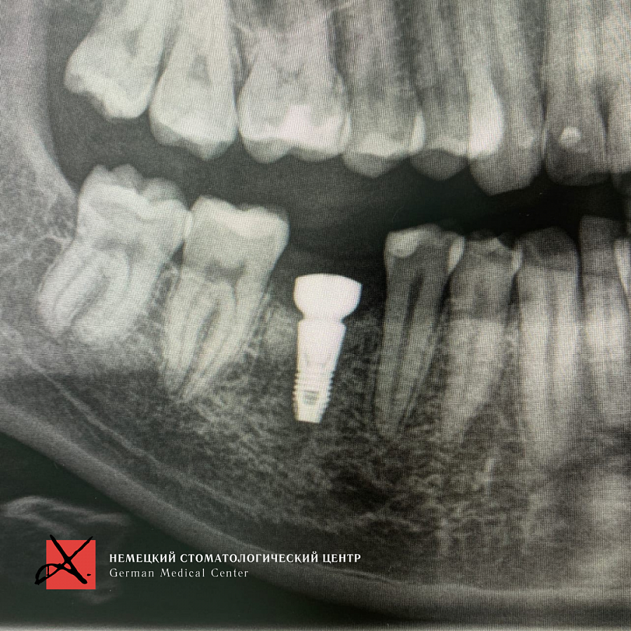 Зуб был фрагментирован, чтобы удаление прошло максимально атравматично, то есть без повреждения окружающих костных стенок. После удаления установлен имплантат. Операция прошла успешно, пациенту уже установлена зубная коронка.