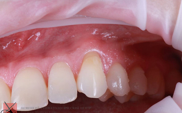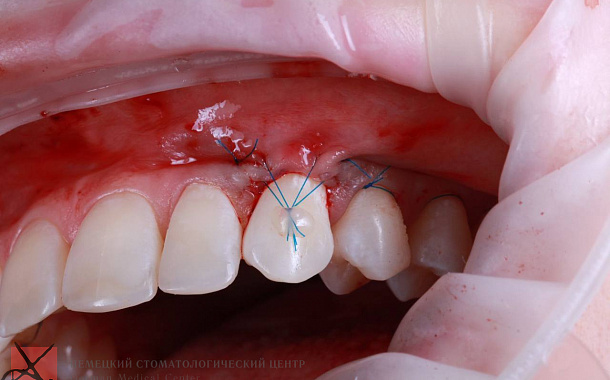 Было предложено комплексное лечение, одним из этапов которого была операция по закрытию рецессии десны мягкими тканями.