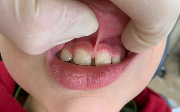 Уздечка губы крепилась слишком низко, из-за чего передние зубы при прорезывании разошлись в стороны, образовалась диастема.