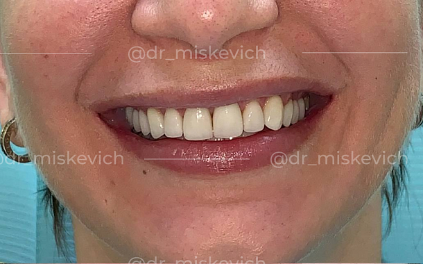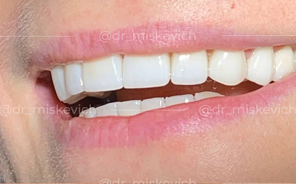 Нам удалось решить все возникшие проблемы и нормализовать функциональную работу всей челюсти с помощью виниров.