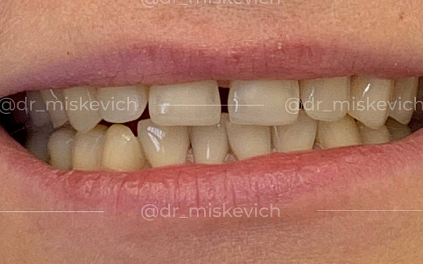 Молодой девушке не нравились промежутки между зубами и эстетический вид верхних передних зубов в целом. Хотелось сделать улыбку красивой, зубы ровными.